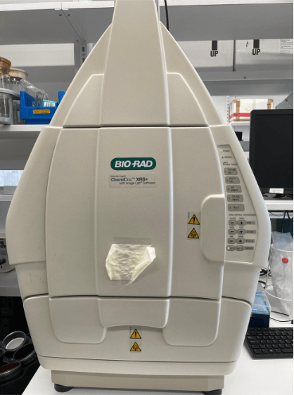 150500 SEKSystem, chemidoc XRS + imagelab (bought in 2018). Gel and blot imaging system for chemiluminescence and fluorescence; large imaging area (~26×35 cm) in a light-tight hood, Peltier‑cooled CCD camera; controlled by Image Lab software; compatible with Trans-Blot workflows. No service maintenance and issues with camera was reported previously.