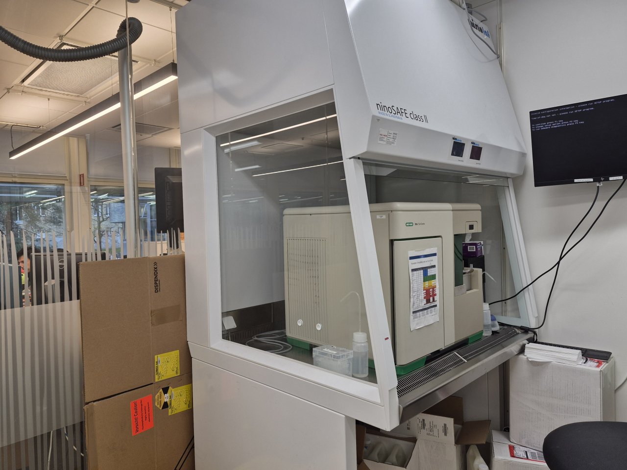 The bench is extra deep (82 cm) to comfortably accommodate instruments. The bench is 120 cm long and height-adjustable. Originally over 160,000 SEK. Available for viewing at SciLifeLab, Solna.