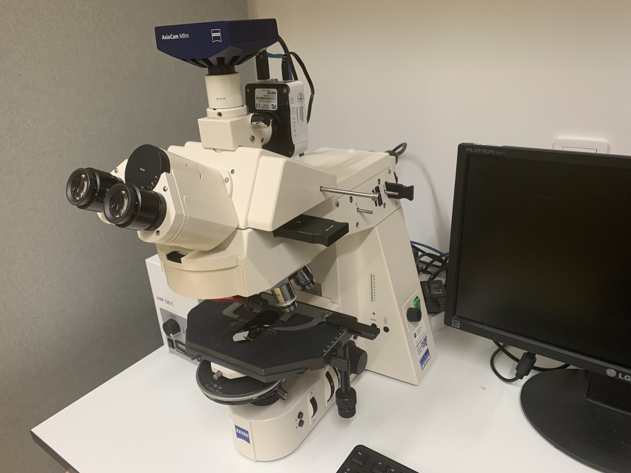 50000 SEKZeiss Axioplan 2 upright fluorescence microscope with 3 standard filters. Motorized filter and objective changer that can be controlled from the computer, which is old but included (with necessary software). Microscope is equipped with two cameras, one for fluorescence (Axiocam) and one color camera. Fluorescence lamp was changed in July 2025. Microscope has some minor wear-issues but works really fine!