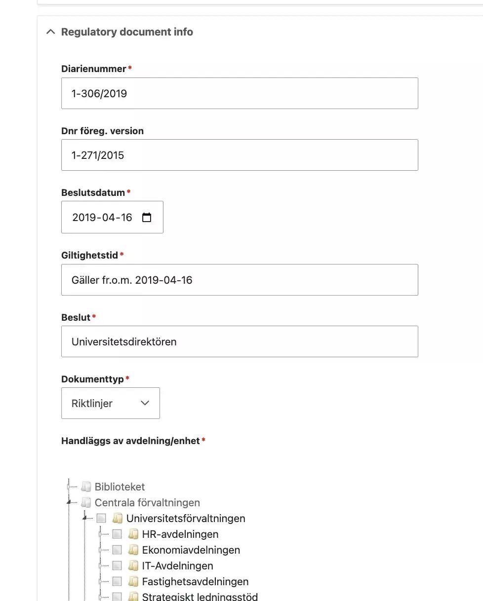 The page type Regulatory document is intended for the six types of policy documents available at KI. A policy document should always be presented in this page type. You can supplement with explanatory and in-depth information on regular pages.